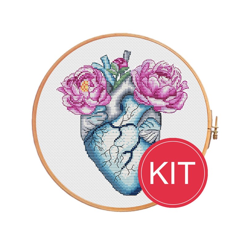 Flower Anatomical Heart Cross Stitch Kit Modern Cross Stitch Human Anatomy Anatomical Heart Floral Heart Valentines Gift Herbal