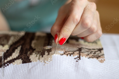 Woman Working On Cross Stitch Embroidery Stock Photo And